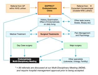 Who runs the clinic, what is involved in clinic appointments and how to prepare, and next steps after clinic are summarised here. Who runs the EXPPECT Endometriosis Clinic?The EXPPECT Endometriosis Clinic currently takes place in the Gynaecology Outpatient Department in the Simpson Centre for Reproductive Health at the Royal Infirmary of Edinburgh. Please check your clinic appointment letter carefully as some of our appointments are now carried out via video-conferencing or telephone, and there are occasionally extra clinics taking place at St John’s Hospital in Livingston.The EXPPECT Endometriosis Team consists of five Gynaecology consultants who have experience and expertise in endometriosis treatment, supported by our Endometriosis Nurse Specialist.When endometriosis is suspected to affect the bowel or bladder, our colleagues in Colorectal and Urological surgery will provide us with support. HTML What will happen to me at my appointment?A member of the EXPPECT Endometriosis Team will see you and review your symptoms of endometriosis. This will cover previous investigations and treatments for endometriosis, and importantly the effect of your symptoms on your day-to-day life.An examination is usually helpful in assessing this fully. The abdomen (tummy) and pelvis (vagina) are examined with your permission, and the support of a nurse chaperone. There is always privacy to undress and dress.The effect of endometriosis can vary hugely between women. The recommendations suggested will be individualised. Below are examples of possible plans for care, of which one or more may take place in sequence or in parallel.InvestigationsFurther investigations may be arranged to detect evidence of endometriosis or alternative causes for symptoms experienced. These may include blood tests, vaginal swabs to check for infections, ultrasound or MRI (Magnetic Resonance Imaging) scans, or biopsies (small samples) from the womb lining or from the cervix (neck of the womb). More specialist tests involving the bladder (e.g. cystoscopy) and bowel (e.g. sigmoidoscopy) may be required, meaning additional appointments have to be arranged.Medical TreatmentsMedical treatments for endometriosis may be started. These fall into three broad categories. Treatments that involve taking extra hormones Treatments that result in lower hormone levels Treatments that alter nerve pathways which transmit painSurgical TreatmentsSurgical treatment and investigation for endometriosis may be arranged. Laparoscopy (keyhole camera) is usually arranged in the Day Surgery Unit at the Royal Infirmary or St John’s Hospital where most women will be able to be discharged the same day.Mild to moderate endometriosis can be treated if discovered at the time of surgery.Moderate and severe endometriosis may be treated by keyhole or traditional open surgery but may require a longer operation, in which case the endometriosis is often treated at a second procedure. This will usually involve an overnight stay in the gynaecology ward.Multi-Disciplinary Meeting (MDM)When other factors make endometriosis surgery very complex or high risk, we discuss cases at our Endometriosis MDM. This is a full review of your history, examination findings and the results of any investigations (or previous surgery) with the EXPPECT Endometriosis Team, radiologist colleagues and other colleagues as required.We use this to plan your medical management and/or the type of surgery proposed (and the safest place for it to take place, and if direct involvement of our colleagues in the Western General Hospital is required). This means that some women will be offered a date for surgery at the Western General Hospital.The MDM is also used to review and guide improvements in our service. HTML How can I prepare for my appointment?Most women will be referred by their GP in Lothian. Referrals from outside NHS Lothian will be made by a Gynaecology Consultant in the woman’s Health Board.It can be helpful to bring a family member or friend for support and any questions you have to the Clinic.We have an active Endometriosis and Pelvic Pain research programme. Should you be suitable for one of our studies, a researcher or one of our clinical research nurses may approach you for the optional opportunity to discuss any research in more detail. HTML What will happen after my appointment?This will depend very much on your unique set of symptoms and the results of your investigations, which will guide your treatment.An idea of the steps involved are shown in the flowchart. What happens at dietetic clinic?Dietitians can provide evidence-based information on diet as well as personalised nutritional advice for gastrointestinal symptoms or onward referral to other dietetic specialities as required.Whilst diet cannot cure pelvic pain or endometriosis seeing a dietitian may help improve your quality of life, relationship with food and/or may improve symptoms.When you see a dietitian at clinic, you will be asked about your nutritional concerns and health goals. The dietitian will then complete a nutritional assessment which includes asking questions about your weight and weight history, checking your blood results, gathering information about your clinical condition, asking about your diet and dietary habits and environmental factors which may affect your diet.At the start of your appointment your weight will be taken, if you feel uncomfortable being weighed or do not wish to know your weight, please make this known to the dietitian.A new appointment takes 45 minutes, and a review appointment is 30 minutes.Referrals to the EXPPECT Dietitian usually come from a member of the EXPPECT Team. This article was published on 2024-09-10